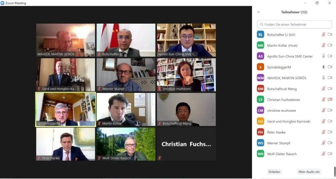 4月26日,李曉駟大使應邀出席奧中經貿協會(ACETA)線上交流活動,與奧地利前副總理、協會主席施賓德艾格、維也納市政委員漢克、奧中友協常務副主席卡明斯基、ACETA成員、奧聯邦商會及部分企業(yè)代表就中國疫情防控、經濟形勢、“十四五”規(guī)劃和2035年遠景目標及中奧關系等交換意見。使館孟繁壯經商參贊出席。中國中小企業(yè)中心總經理孫海龍應邀參會。