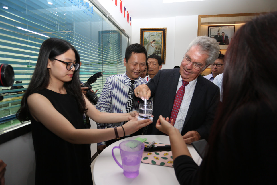 △來揭出席中奧企業(yè)合作洽談會的奧中友協主席、奧地利共和國前總統(tǒng)海因茨•菲舍爾考察大宇環(huán)保公司,體驗水凈化筆的凈水過程