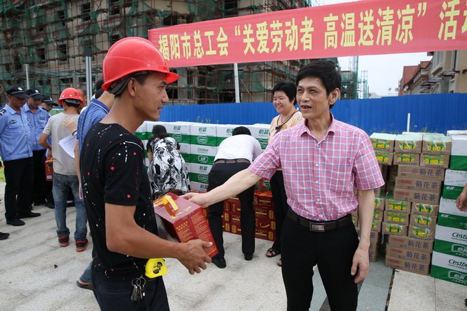 立秋雖過(guò),暑熱難退。為做好高溫期間勞動(dòng)者的服務(wù)工作,8月10日下午,揭陽(yáng)市總工會(huì)走進(jìn)中德金屬生態(tài)城,開展“關(guān)愛勞動(dòng)者,高溫送清涼”活動(dòng),為奮戰(zhàn)在項(xiàng)目建設(shè)一線的職工送去解暑降溫的慰問(wèn)品,傳達(dá)組織的問(wèn)候與關(guān)懷之情。